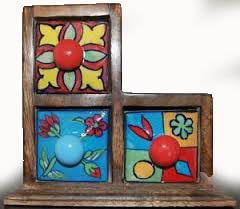 Wooden Box With Three Ceramic Drawers 18cm x 17cm x 9cm